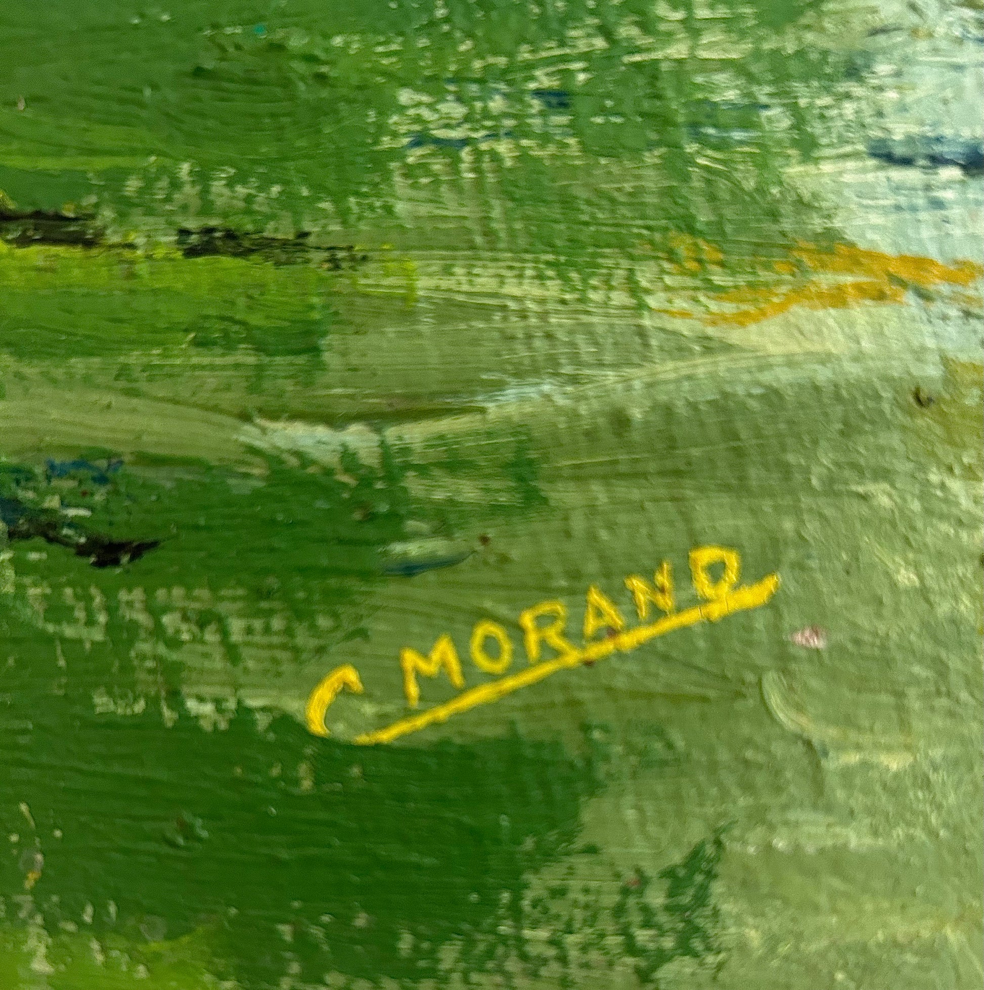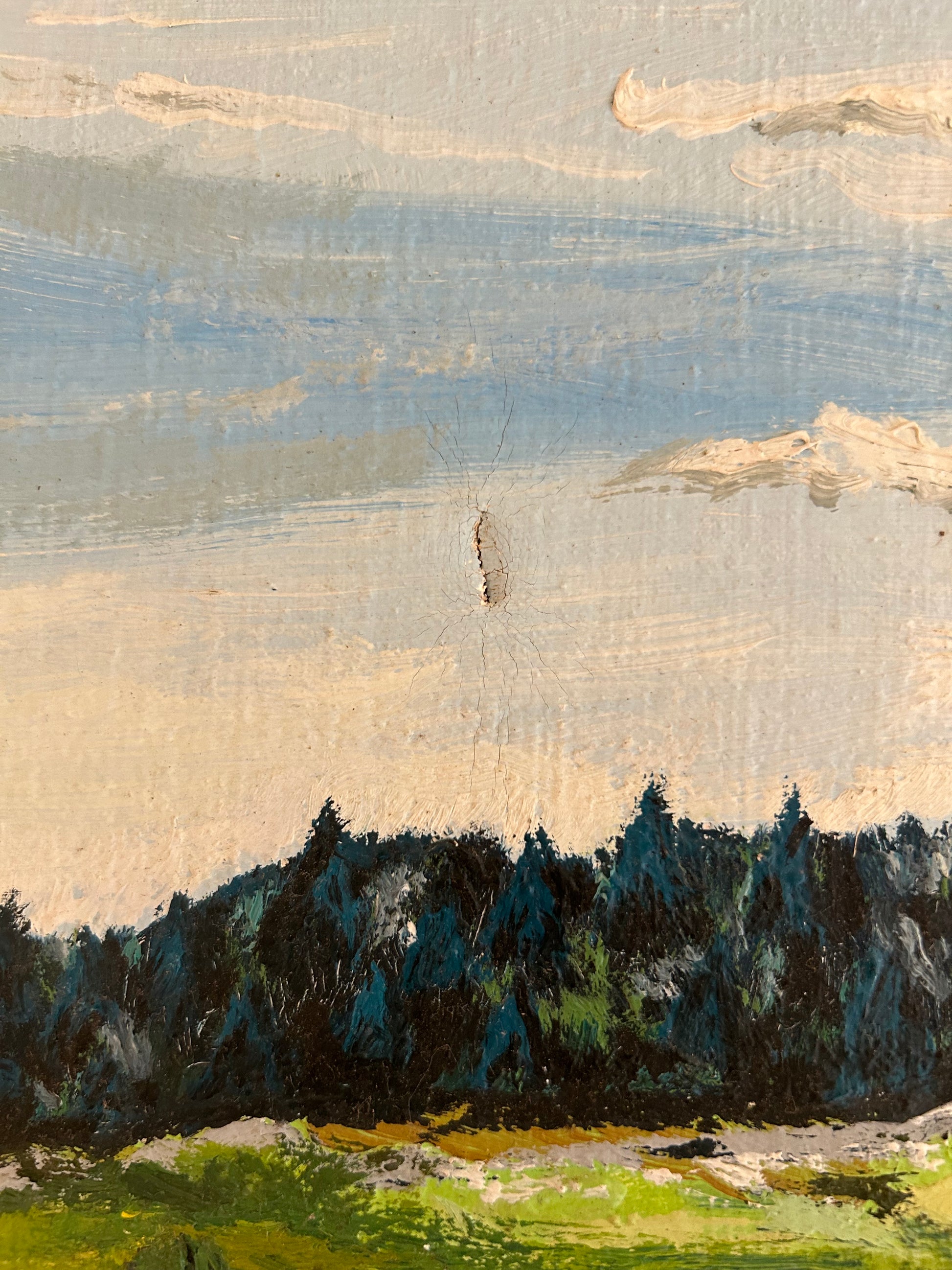 Likely antique, this signed original painting is a beautiful French countryside landscape in acrylic on canvas. Purchased on our recent trip to Paris. It has a slight break in the canvas about 1/2” long, noted in pictures. Approximately 26” x 18”