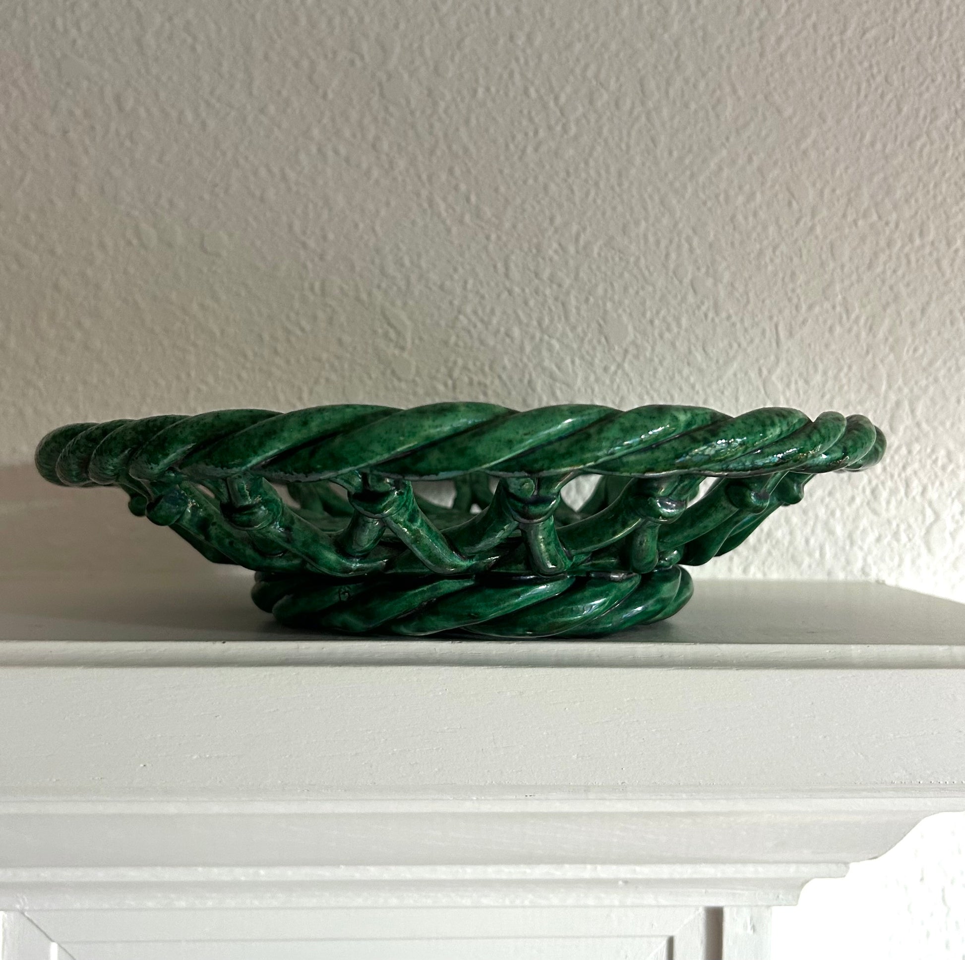 Paris- 10.5” x 2” Vintage Vallauris Ceramic Basket: Deep Green Weave 1950s
