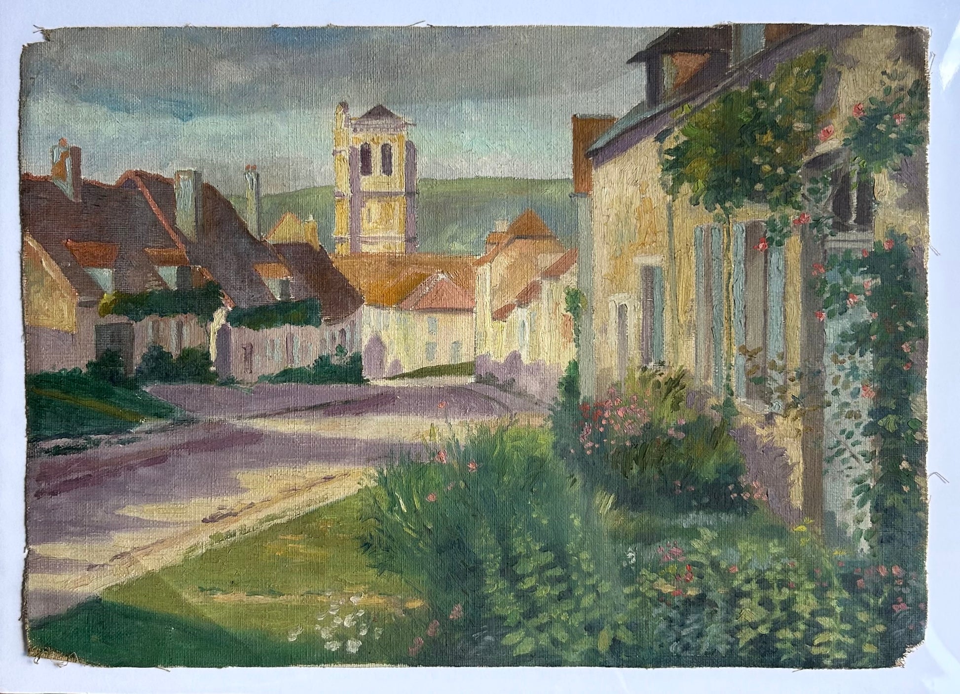 Found in Paris, oil on canvas painting without frame depicts a street lined with old buildings, with a prominent church tower in the background. The style is impressionistic, with visible brushstrokes and a focus on light and shadow. The warm tones of the buildings and the cool, overcast sky suggest a specific time of day, possibly late afternoon. The foliage and flowers along the street add a touch of nature and color to the scene.