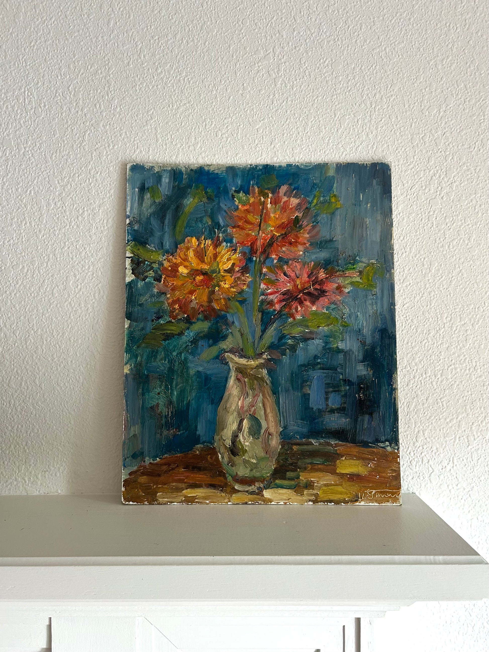 Hand sourced in Paris. Beautiful vintage (1960s) impressionistic original oil on board painting. Vibrant colors depicting a vase of flowers collected from the garden.