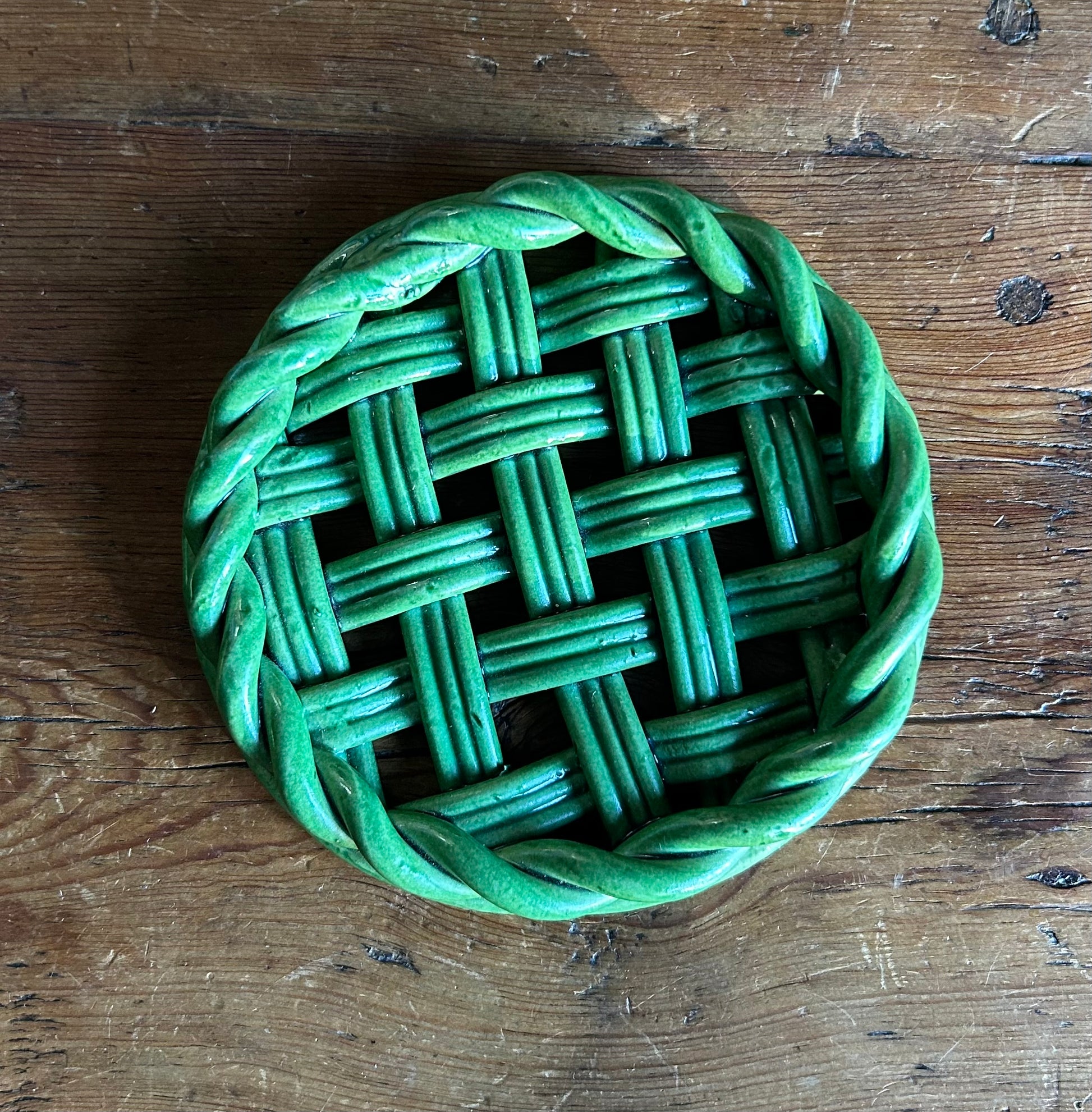 Beautiful deep green woven ceramic 5” round coaster. There are 2 available, sold separately. Excellent condition, no chips or cracks